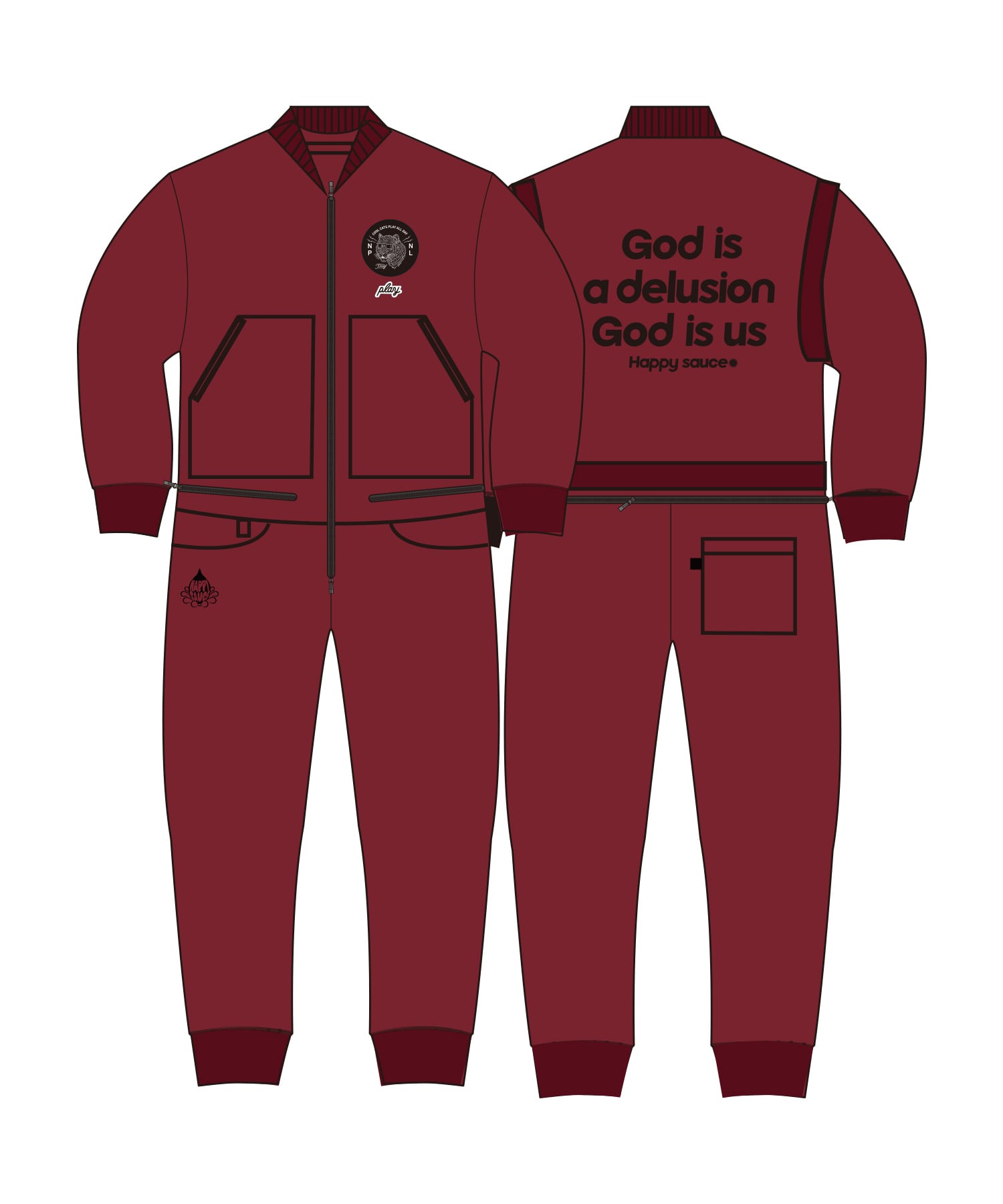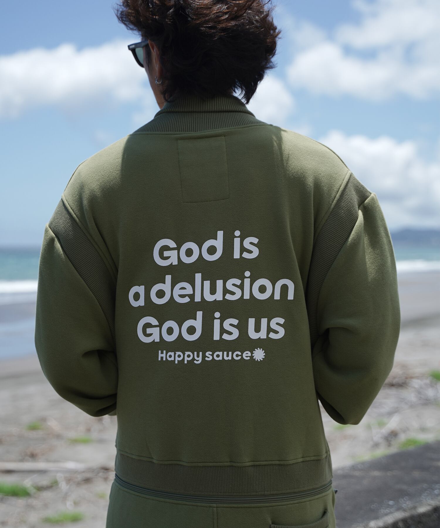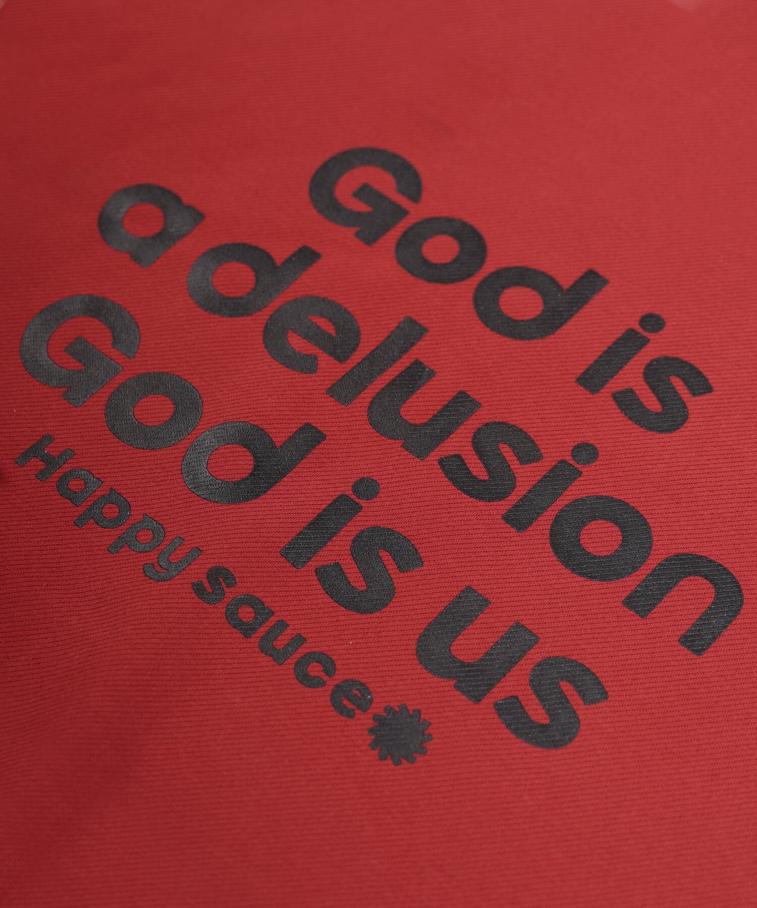 背面には「God is a delusion, God is us(神は妄想である。神は私たちだ)」のメッセージを継続プリント。