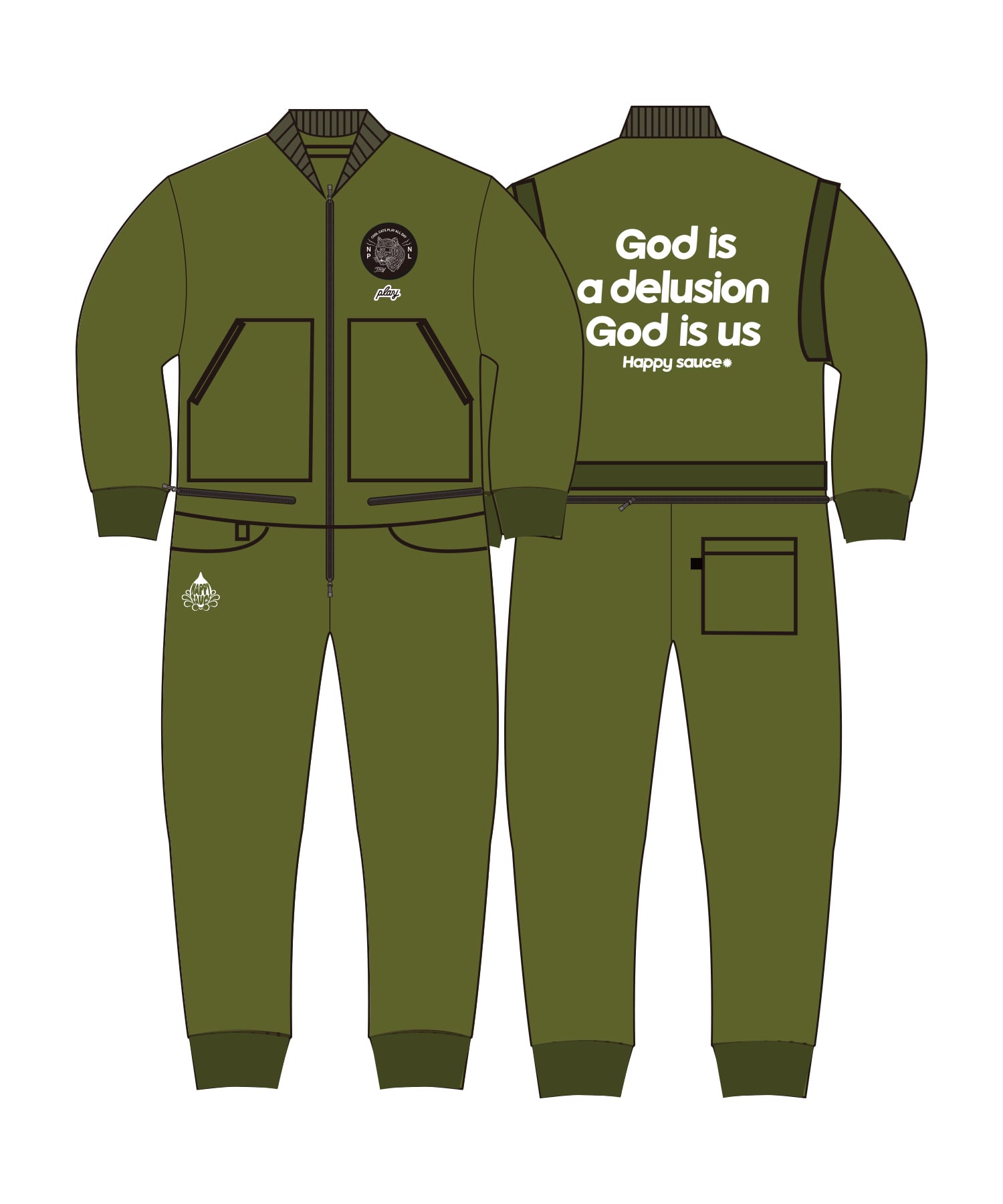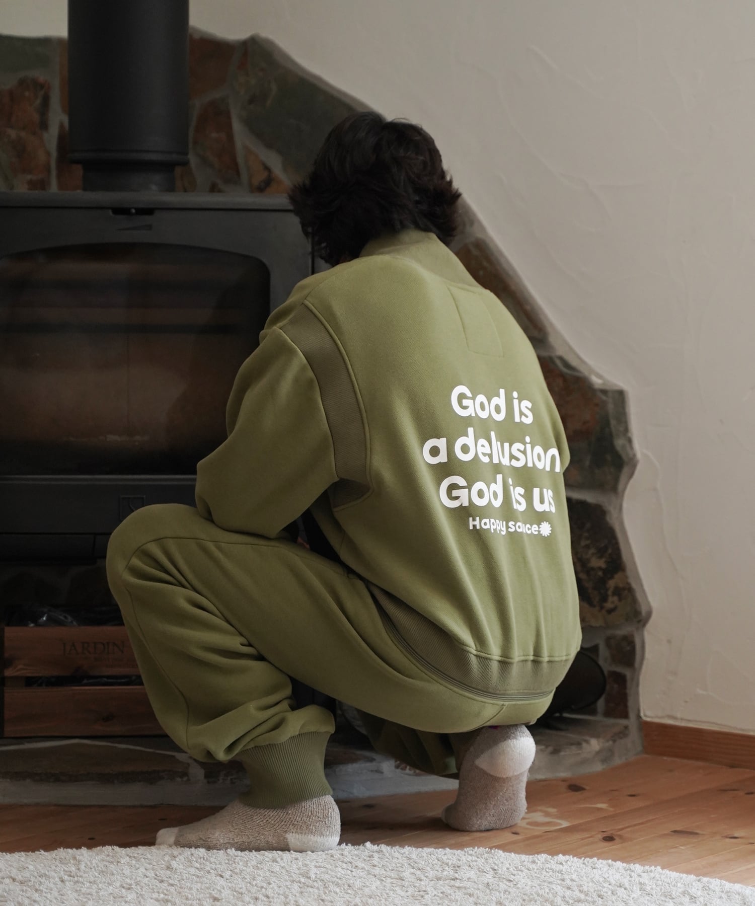 背面には「God is a delusion, God is us(神は妄想である。神は私たちだ)」のメッセージを継続プリント。