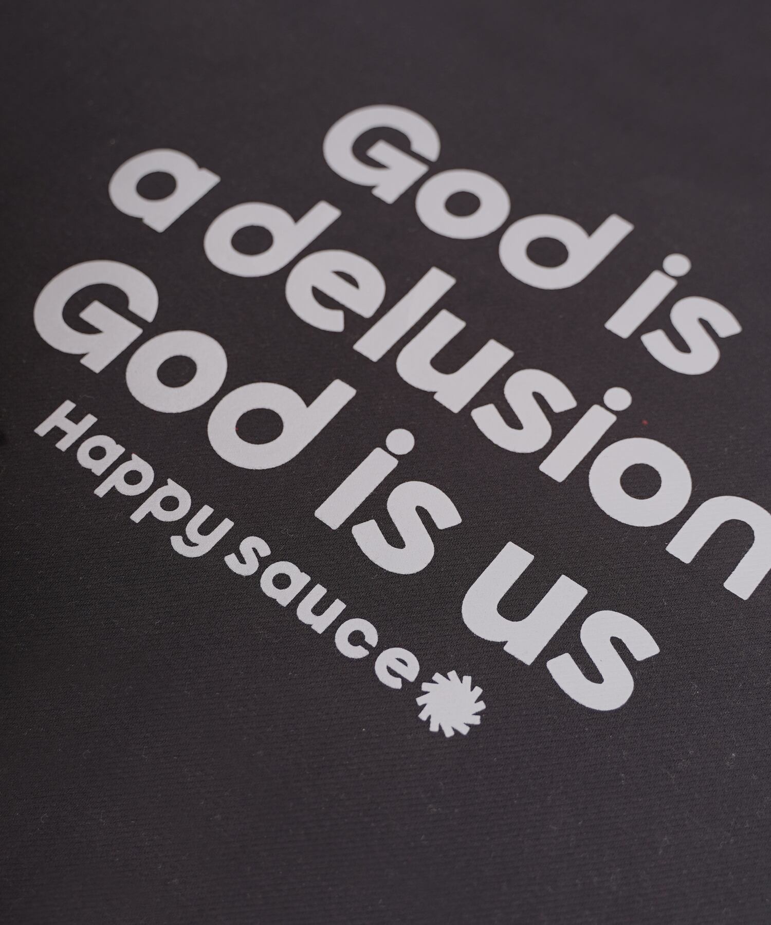 背面には「God is a delusion, God is us(神は妄想である。神は私たちだ)」のメッセージを継続プリント。